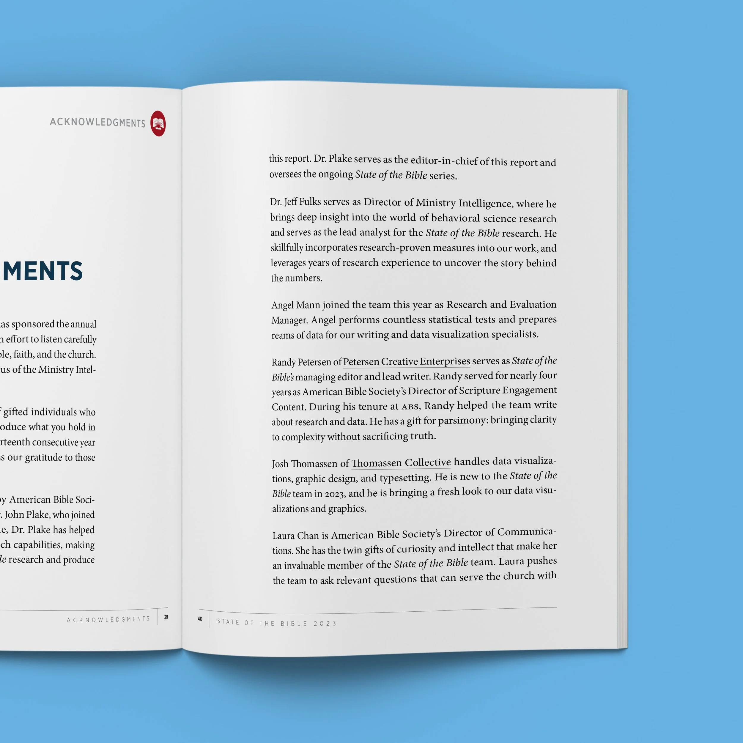 Since 2023, Thomassen Collective has partnered with the team at American Bible Society in Philadelphia to provide graphic design + data visualizations for their State of the Bible report.